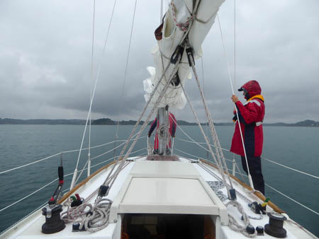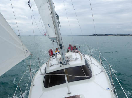 Le skipper (Pascal) décide de partir vers 11 h 00 pour bénéficier d’un bon vent avant la pluie de l’après-midi. Record à 6,7 nœuds !