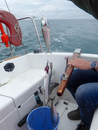 Puis le vent faiblit et Pascal propose de lancer la ligne. Quelques minutes après, trois beaux maquereaux sont ramenés à bord.