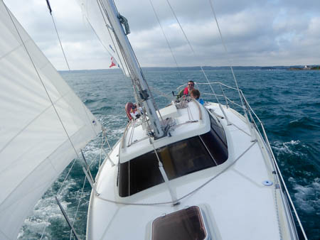 Départ par un petit vent de travers qui réjouit l’équipage (enfin, presque tout l’équipage !).